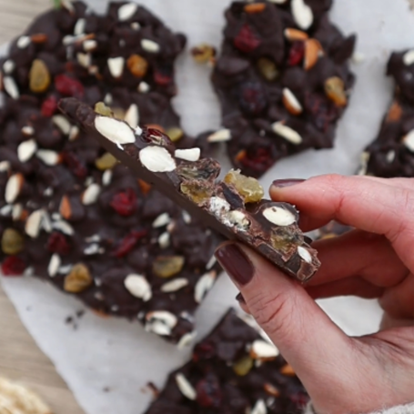 Vil du lave hurtig og lækker julekonfekt - så er dette noget for dig! Sprøde majskager, knasende nødder og syrlige bær sammen med mørk chokolade er en perfekt kombination!